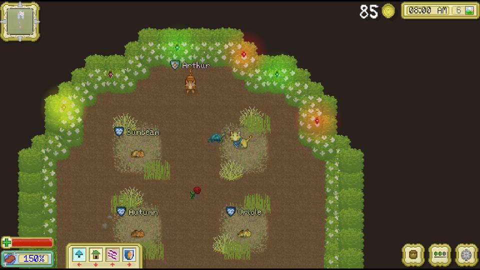 Cattails’ map sprites for both prey and cats are super cute, and so are the cat’s individual close up portraits! The map overall could use an extra detail and shading pass, as it appears a bit flat in places. There are a broad variety of cat pelt colors to choose, available from different vendors and festivals. You can tell which colony cats may have been designed by Kickstarter backers from their unique dialogue and appearances, some sporting unnatural colors. You can increase friendship/affinity with cats in your colony and in other colonies with gift giving to unlock new dialogue and interactions, though it is nothing nearly as complex as the friendship/romance cutscenes in Stardew.