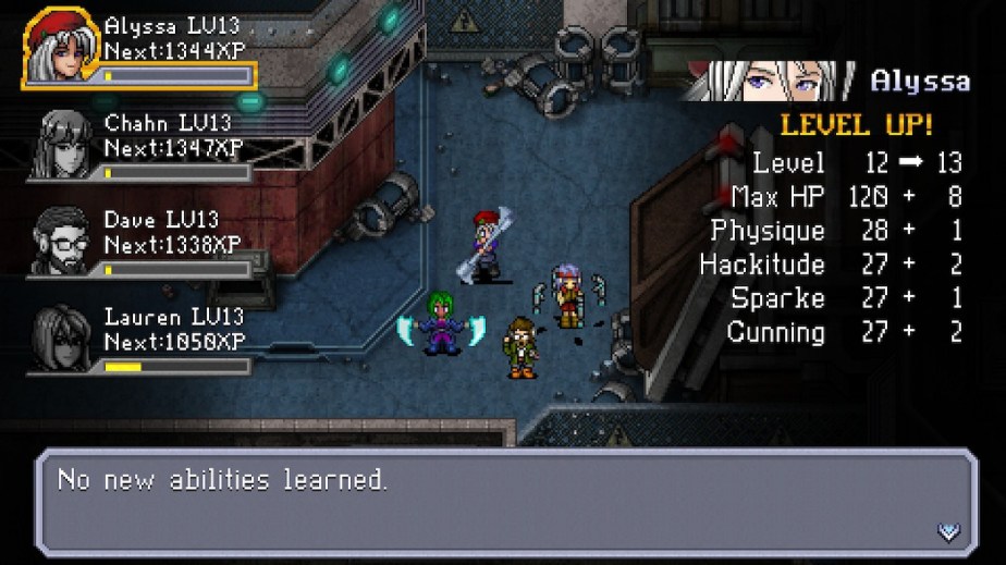 Cosmic Star Heroine features copious, wonderful pixel art cut scenes. I was surprised to find a fully fleshed out music video as the cut scene inside a dance club at one point. The digital synth soundtrack is gritty, moody and fitting, with high energy tracks at just the right times. The battle music could use some extra variety, but is incredibly catchy!